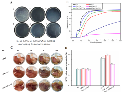 肉类易腐烂,当肉类发生微生物降解时,所产生的挥发性碱性氮(如三甲胺、氨气等)会使环境的pH值发生变化。花青素作为一种pH敏感材料,在不同的酸碱环境中其结构上的可逆变化会产生不同颜色。据此,研究团队设计了一种pH响应型智能食品包装膜,实现了对食品质量的可视化颜色响应监测。该研究采用荔枝壳提取物中的花青素(LE)作为pH指示剂,明胶(Gel)、壳聚糖(Csa)和聚乙烯醇(PVA)作为基体,制备了智能食品包装膜(Gel/Csa/PVA/LE)。Gel/Csa/PVA/LE具有pH响应性,在4 ℃和25 ℃的条件下能够快速地随着鱼肉腐败程度变色,实时反映食品的质量变化。此外,Gel/Csa/PVA/LE还具有较强的紫外光阻隔性能,能够有效降低因紫外光诱导细胞发生脂质过氧化反应,减缓食物腐败;同时还表现出优异的抗菌抗氧化性和力学性能,在肉类食品包装膜领域具有一定的应用前景。