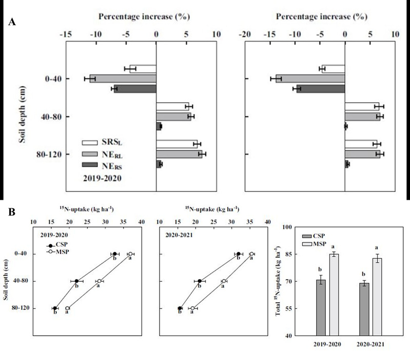 图3.播种模式对不同土层深度15N吸收(A)及总15N吸收量(B)的调控效应