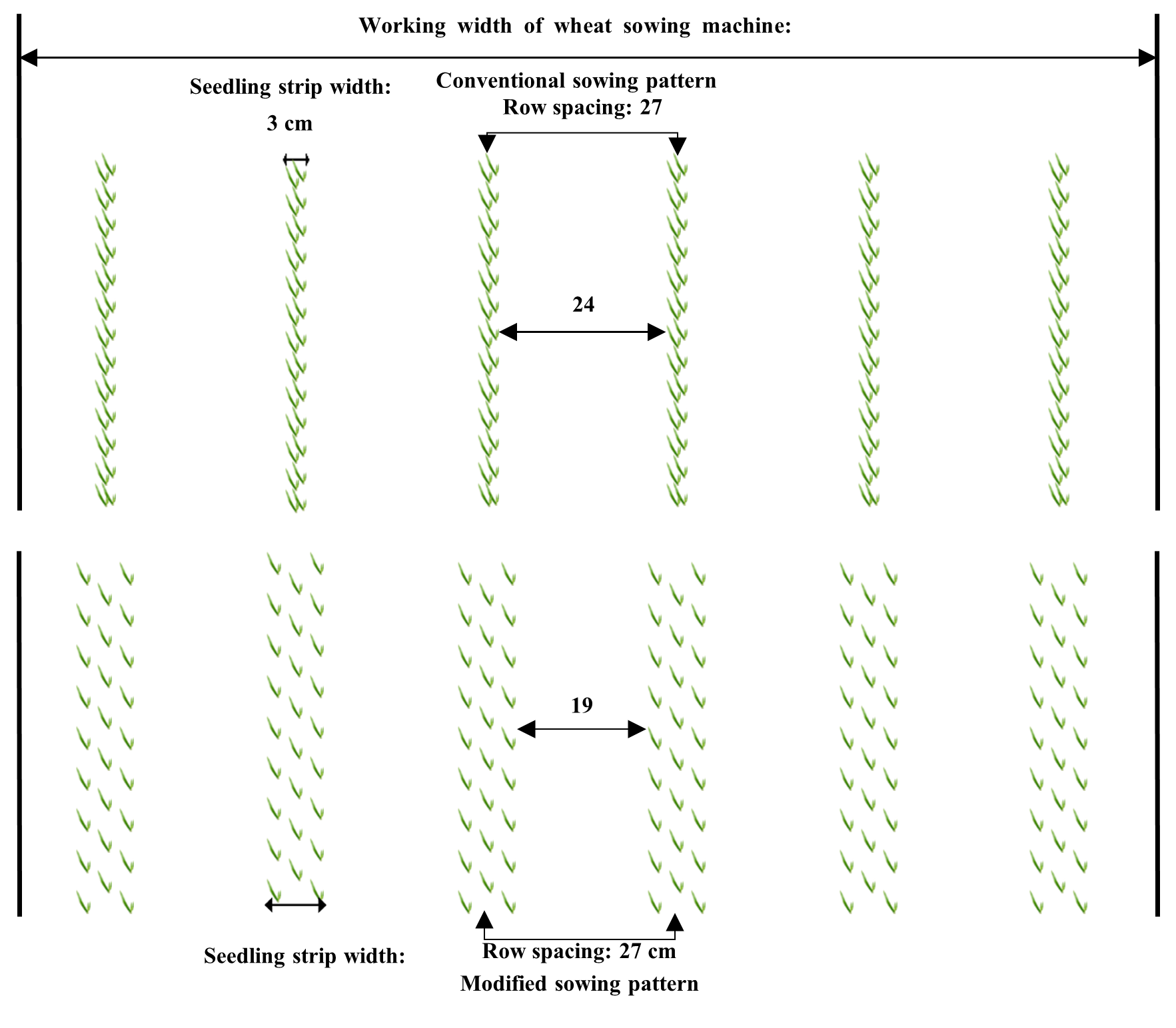图1. 宽幅播种与常规条播示意图