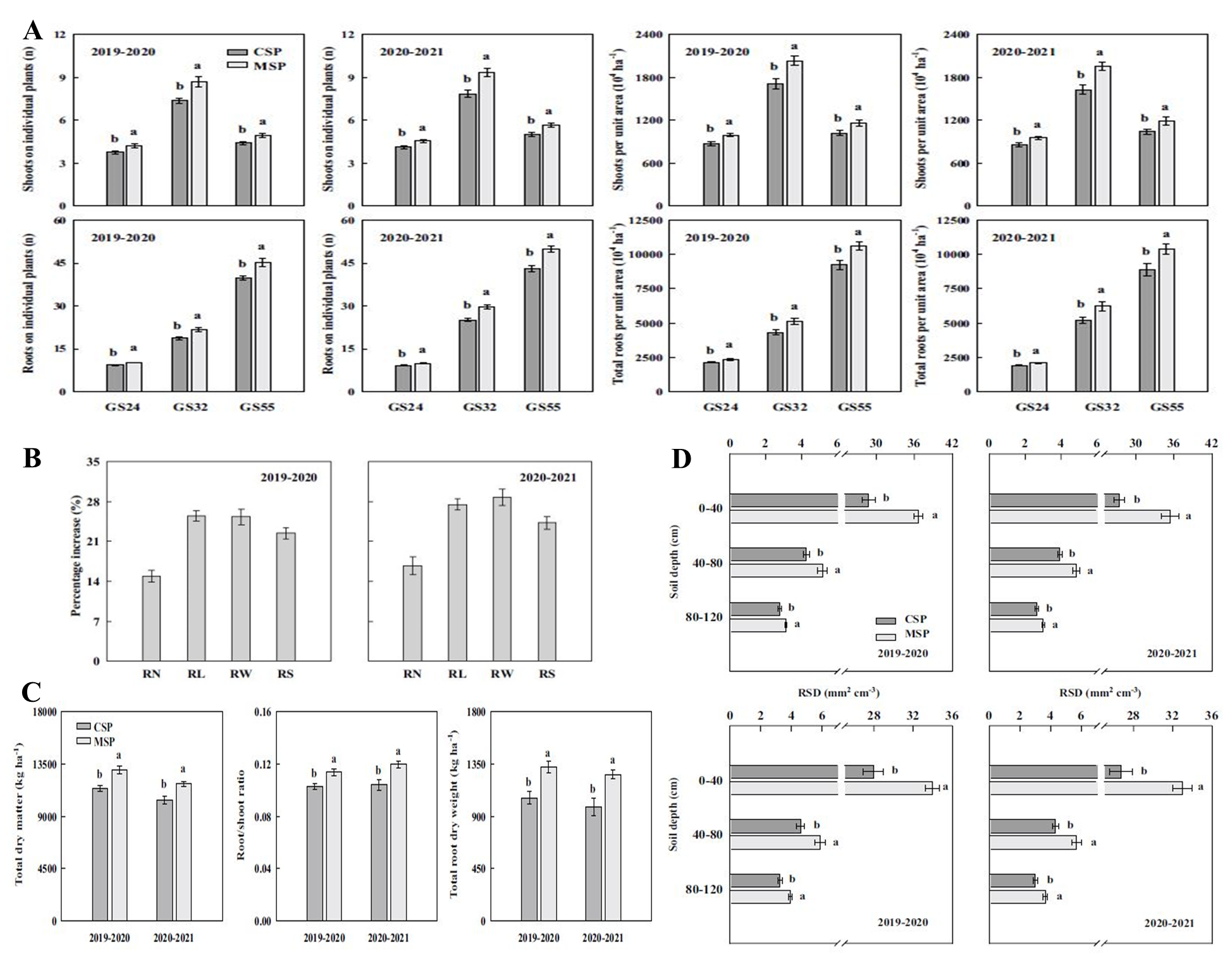 图2.播种模式对冬小麦根系体积的调控效应
