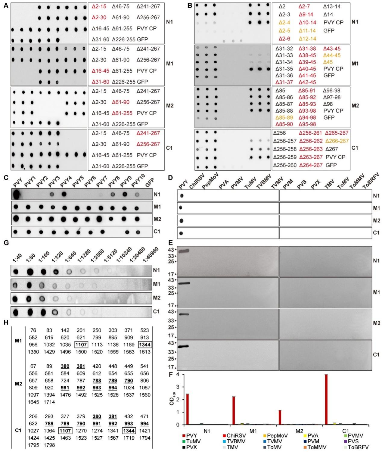研究人员从54个单克隆抗体中筛选到4个识别不同表位的单克隆抗体N1、M1、M2和C1。通过删除突变以及丙氨酸扫描等分析,确定N1、M1、M2和C1识别的最小表位分别为4TIDAGGSTK12,37GTSGTHTVP45,89QFDTWYE95和261LLGVKN266。这四个单克隆抗体识别的抗原表位与国际上广泛使用的PVY单克隆抗体MAb1128、MAb1129和MAb1130不同,而且在PVY CP中相对保守。截至2022年4月12日,GenBank中有1885个PVY CP序列,含有N1、M1、M2和C1识别表位的PVY分离物个数分别为694、1853、1843和1851。将检测范围较广的M1、M2和C1进行组合,发现M1和M2组合可检测所有1885个PVY分离物,M1和C1组合可检测1883个PVY分离物,M2和C1组合可检测1876个PVY分离物。该研究通过将识别CP不同抗原表位的单克隆抗体进行科学组合,实现了所有分离物的全覆盖检测。这种方法可应用于其它植物病毒和动物病毒所有分离物的检测,可有效防止漏检现象。