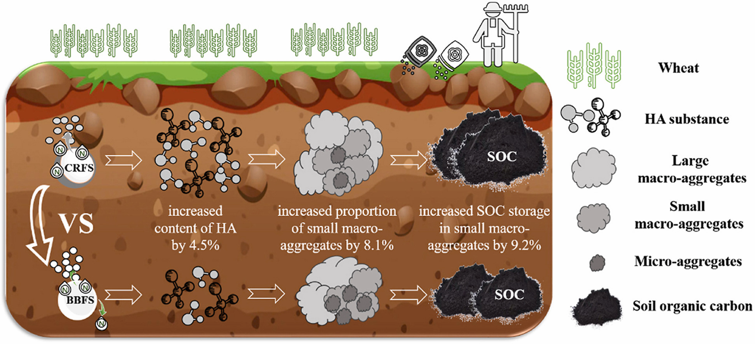 土壤有机碳(SOC)是陆地生态系统中最大的碳库,对作物生产力、粮食安全和农业生态系统的可持续性至关重要。然而,有机碳是一个受多种土壤环境因素影响的非均质物质。因此,土壤中存在不同的SOC稳定过程。其中,土壤团聚体的“分室作用”被认为是碳固存的重要途径。因此,研究土壤团聚体的分布规律对维持农业可持续发展至关重要。秸秆还田被认为是促进土壤团聚体形成的有效田间管理方法。然而,禾本科作物的高碳氮比(C/N)秸秆往往会导致土壤C/N的不平衡。微生物有可能会矿化土壤有机质以获取额外氮素,这可能会抑制土壤团聚体的形成。相反,如果土壤有用足够的氮源以满足秸秆还田条件下的微生物养分需求,这可能会加速秸秆的降解,促进有机物质的释放和团聚体的形成。缓控释肥是一种根据设定的释放速率和释放期缓慢释放养分的新型肥料。我们假设秸秆还田条件下,缓控释肥促进了秸秆降解,释放了不同分子大小的有机物质,改变了土壤胡敏酸(HA)的物质组成和结构,促进了团聚体的形成,最终影响有机碳储存和产量。