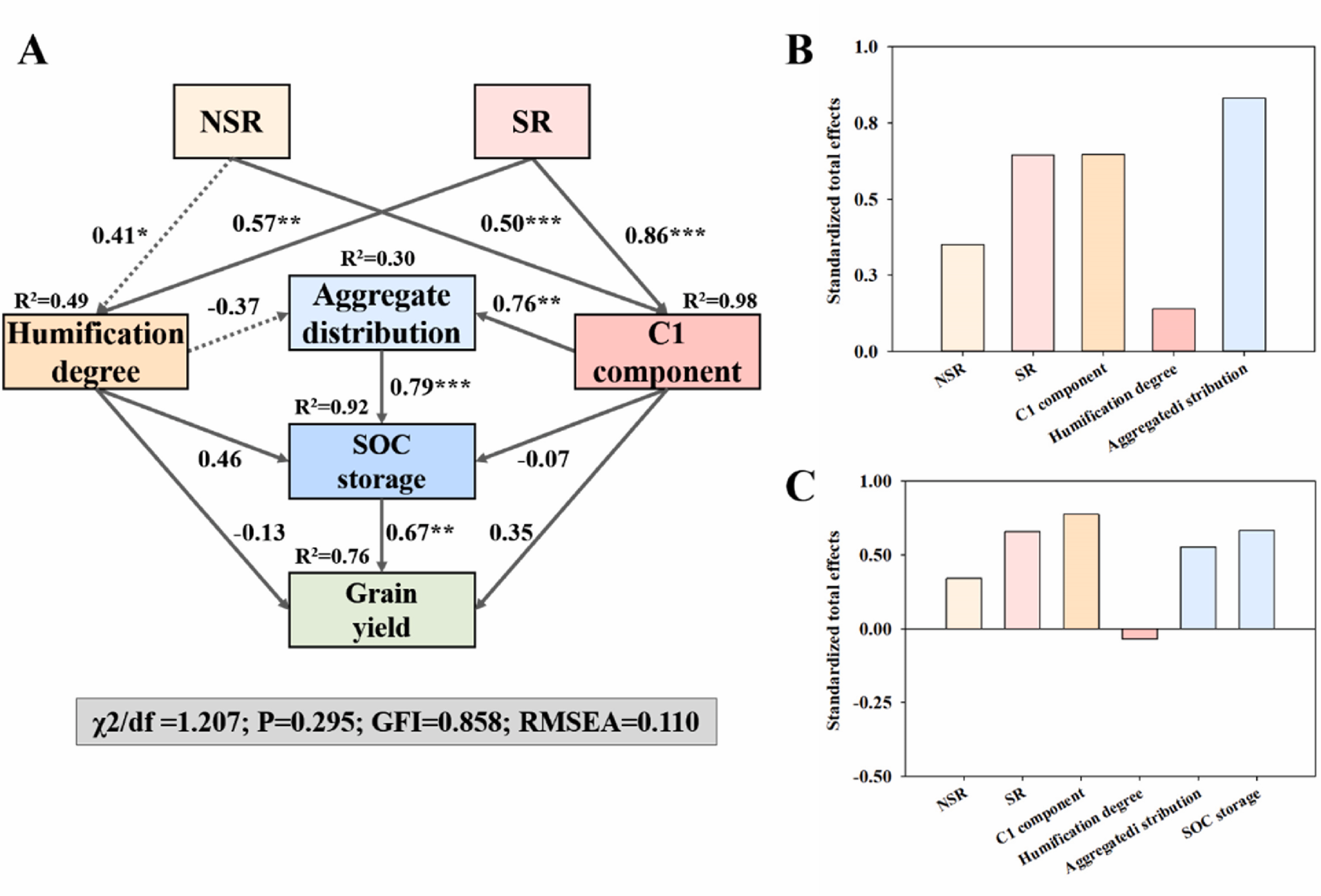 通过结构方程模型(SEM)比较了不同农业模式对土壤有机碳储量和作物产量的影响(图2)。结果表明,不同农业模式对土壤胡敏酸中C1组分均有显著的积极影响,秸秆还田模式(SR)相比秸秆不还田模式(NSR)对土壤C1组分的直接影响更明显。而C1组分也进一步影响了团聚体分布,最终团聚体分布提高了有机碳储量和作物产量。